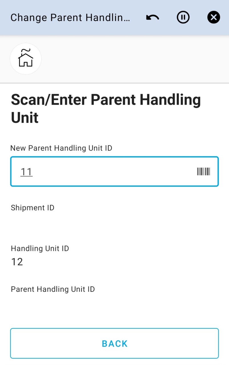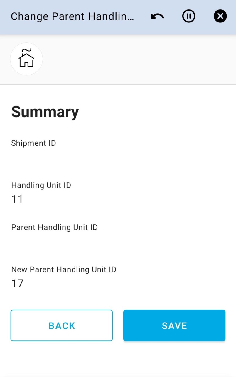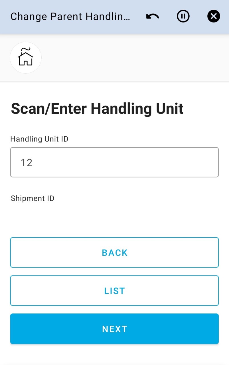 app can be used to change the parent handling unit of a handling unit on the user’s default site. The handling unit can be either shipment connected or not connected.