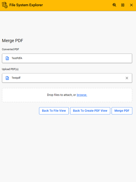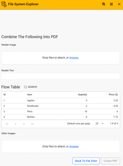 In addition to basic file management, the application highlights advanced capabilities such as generating PDF documents from dynamic content. Users can create PDFs by combining header images, text, and Flow table data into HTML-based templates, as well as append additional images to enrich the output. The application also includes functionality to merge multiple PDF files into a single document for easier distribution and management.