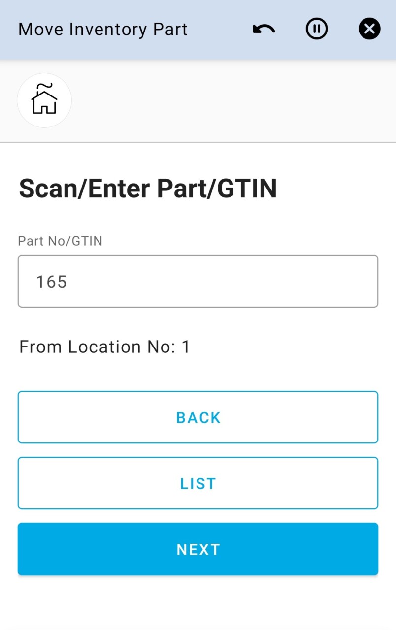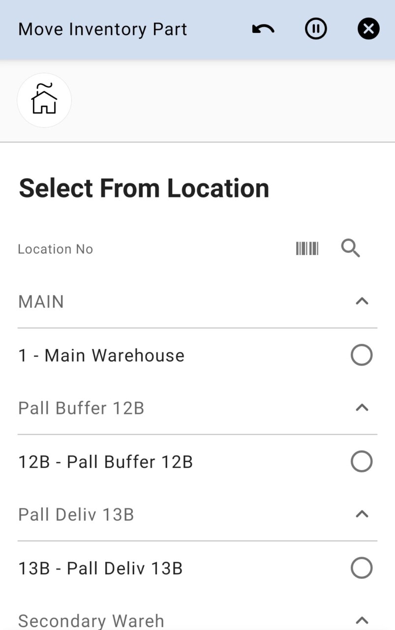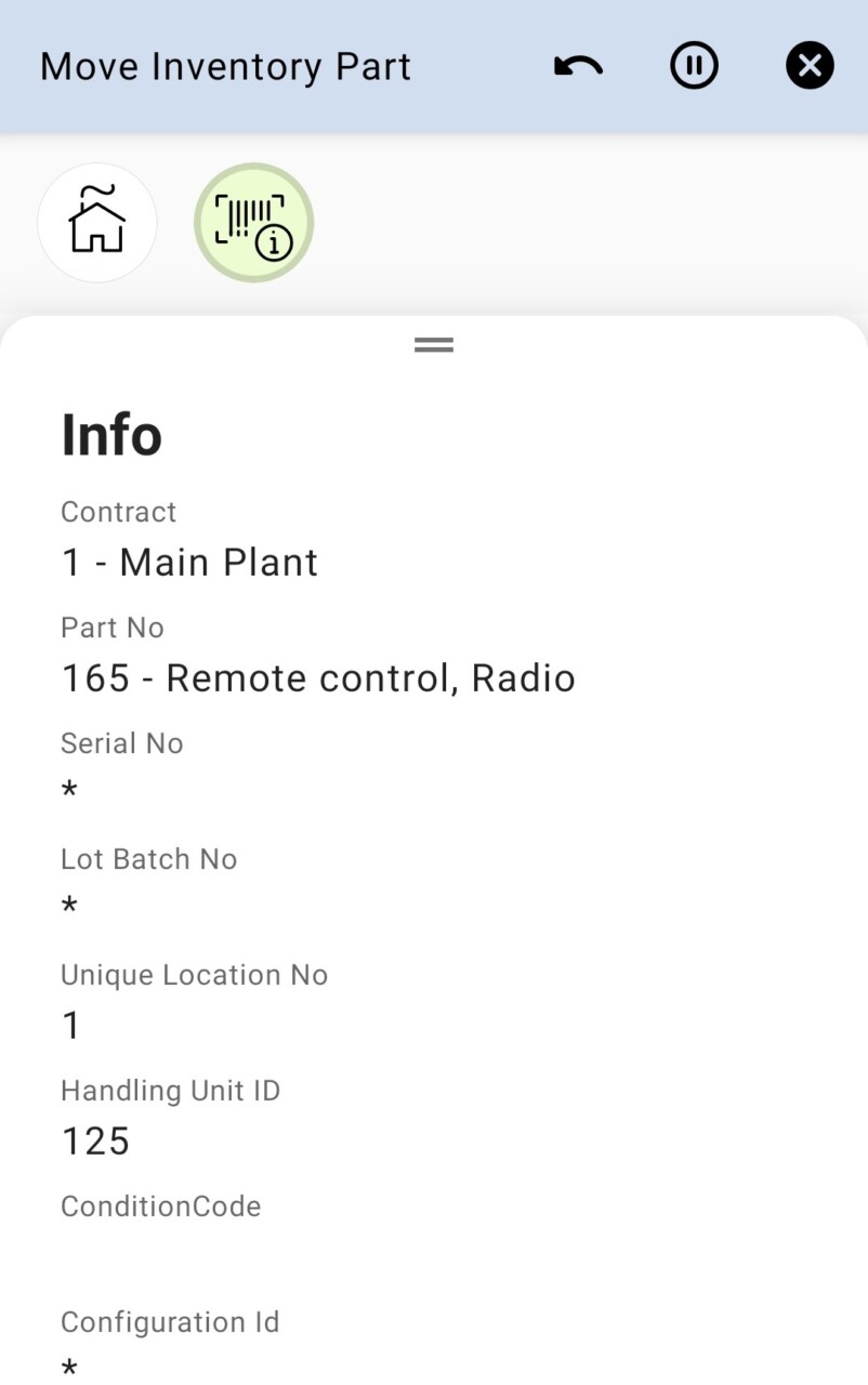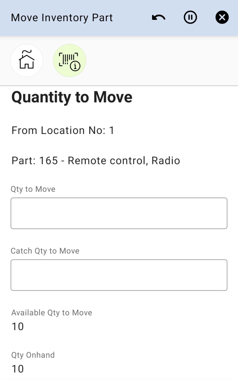 app can be used to move parts from one inventory location to another on the user’s default site. You can choose to move either to inventory or to transit. You also have the option to change the availability control if either one of the involved locations has an availability control.