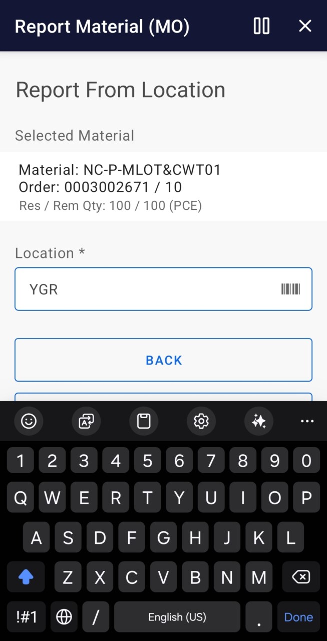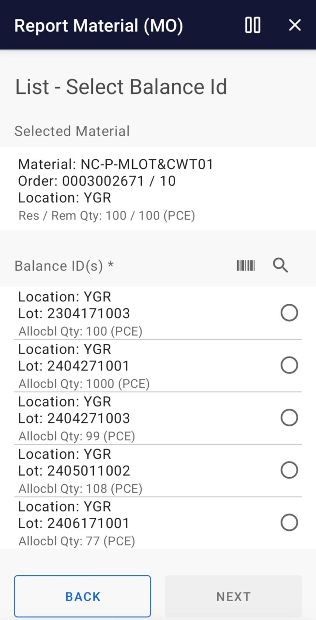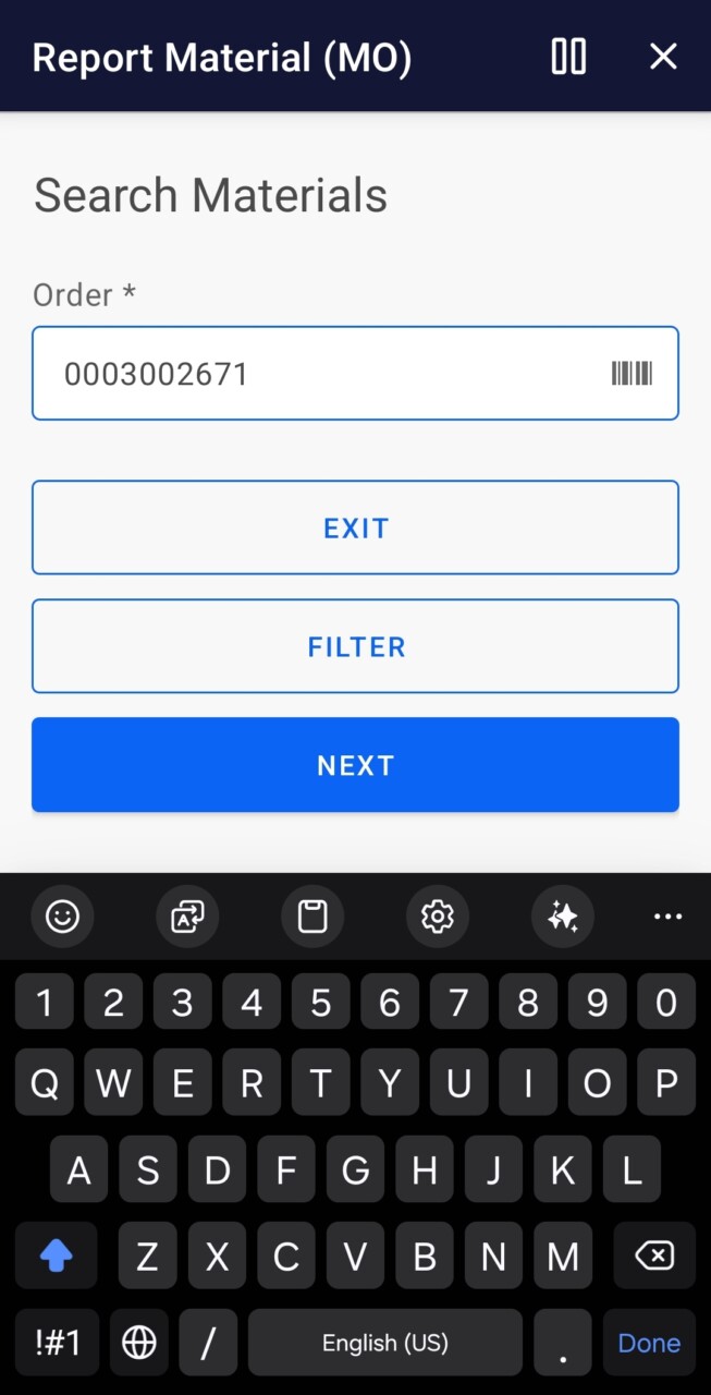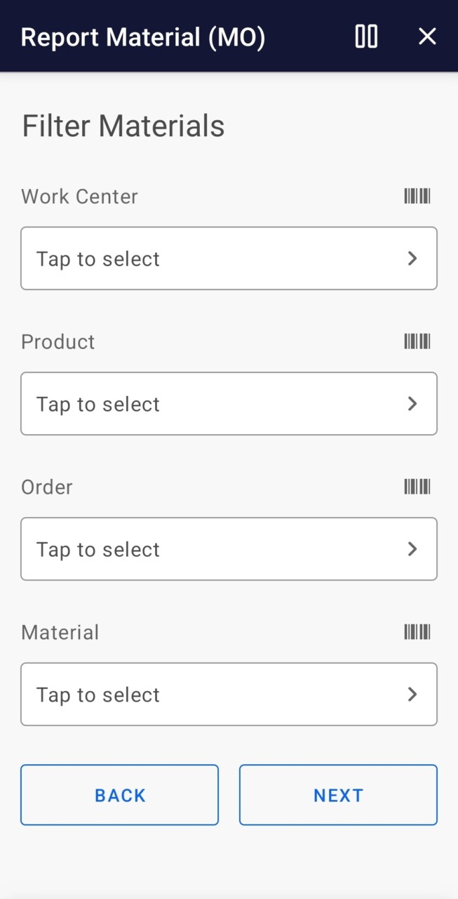 - Filter on Work Center, Product, Order and/or Material.