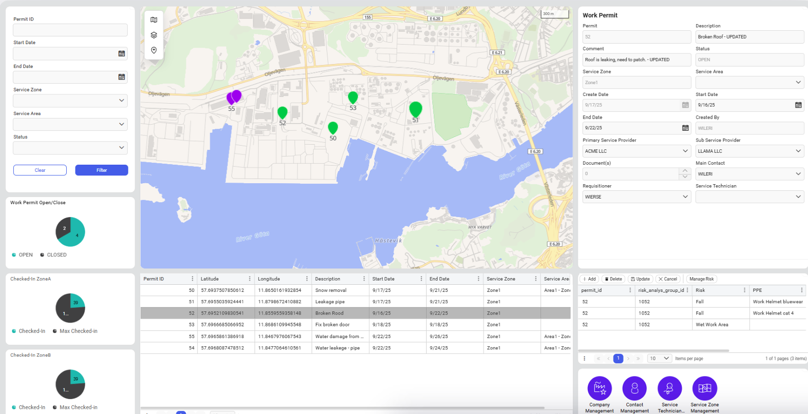 Work Permit Management solution provides operations and safety teams with a centralized, real-time overview of all work permits across service zones and locations. The solution enables organizations to plan, issue, monitor, and close work permits while ensuring safety compliance, traceability, and controlled access throughout the entire work lifecycle.