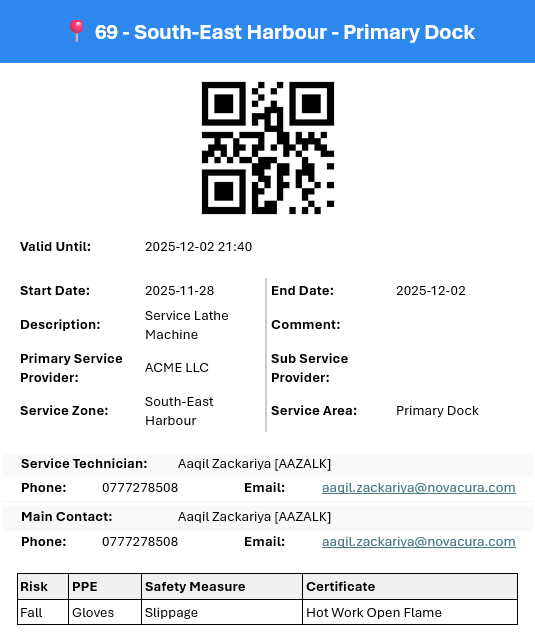 - Operational transparency with detailed logs, schedules, and contact information for every work permit